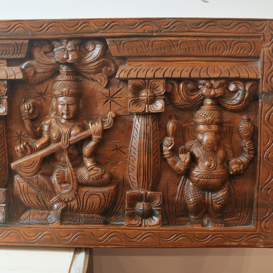 Vintage Hand-Carved Wooden Panel Featuring Ganesh, Lakshmi & Saraswati, Hindu Deity Wall Art, Traditional Indian Craftsmanship, Sacred Temple Décor, Spiritual Home Altar Sculpture, Vastu & Meditation Artwork, Large Unique Collectible Carving