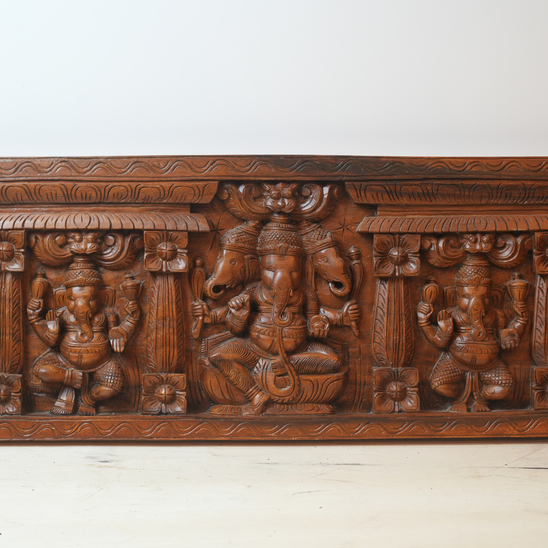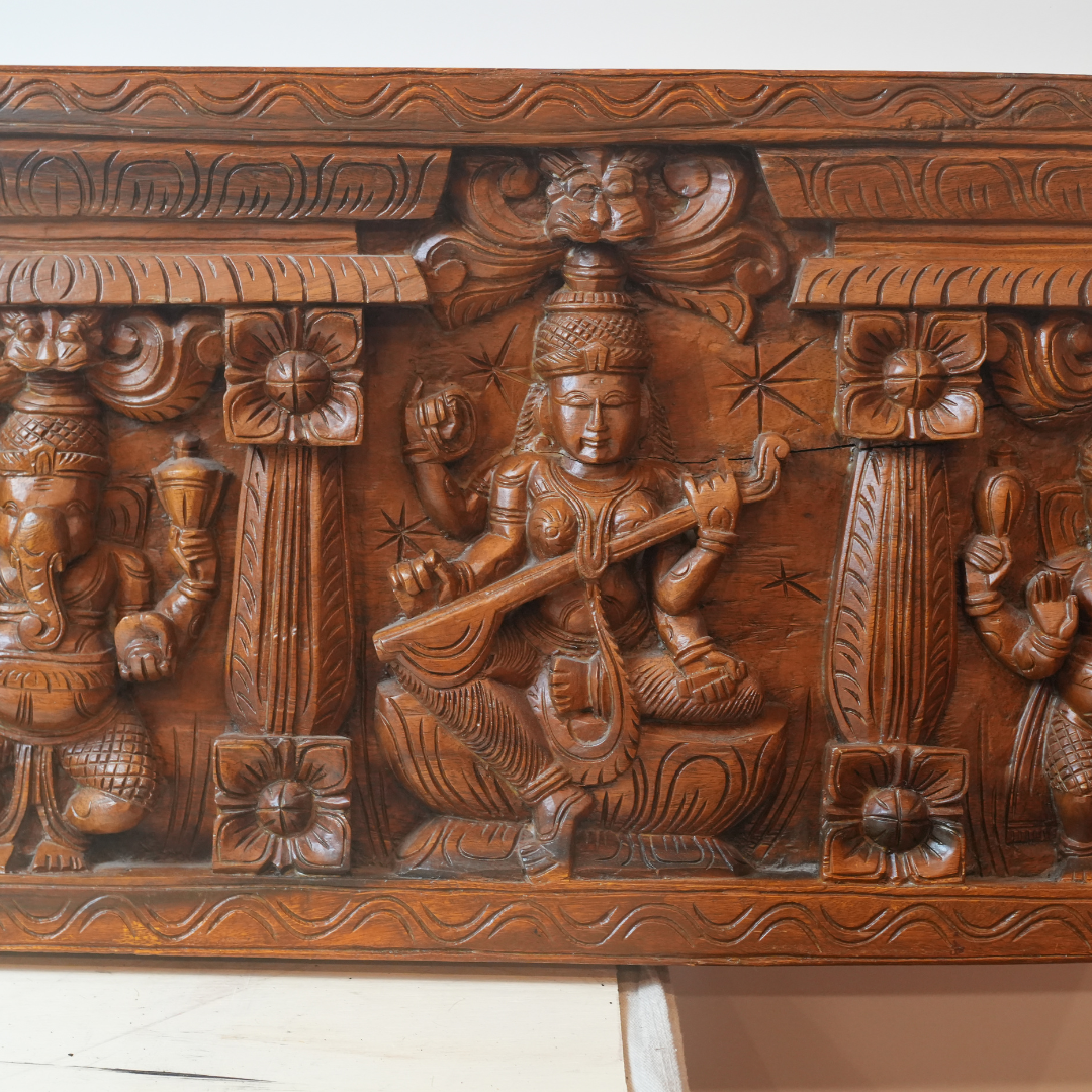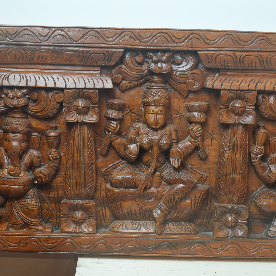 This stunning hand-carved wooden panel showcases three of the most revered Hindu deities: Ganesh, Lakshmi, and Saraswati. Expertly crafted with intricate detail, this vintage brown wood panel embodies the sacred beauty of Hindu tradition and Indian artistry.