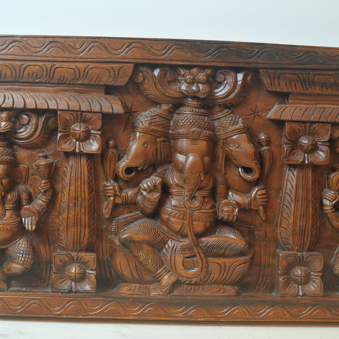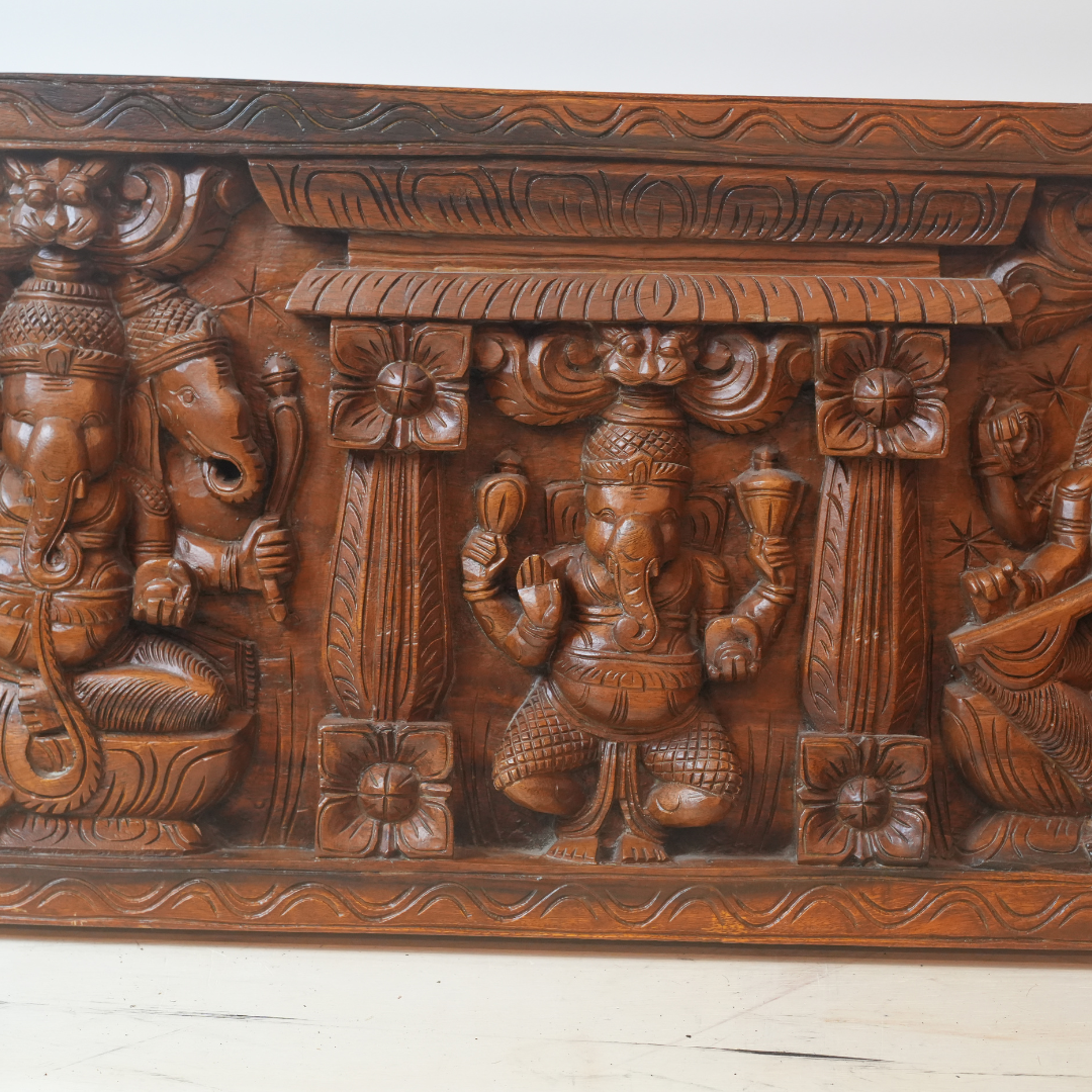 Hand-Carved Wooden Ganesh Lakshmi Saraswati Panel | Hindu Deity Wall Art