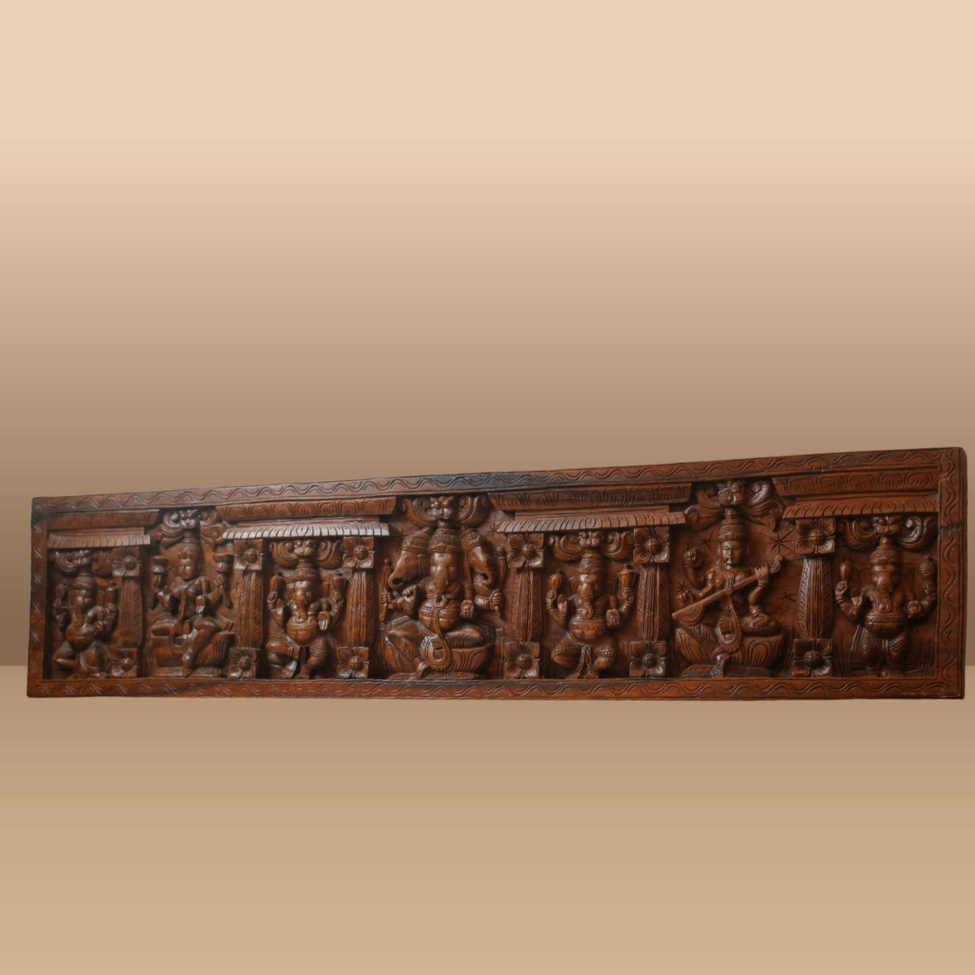 Ganesh, the remover of obstacles; Lakshmi, the goddess of wealth and prosperity; and Saraswati, the goddess of wisdom and arts, are gracefully depicted in this unique carving. Each deity is presented in a detailed and expressive manner, capturing their divine essence. The warm brown wood tone highlights the delicate craftsmanship, making it an ideal piece for spiritual spaces, home décor, or fine art collections.