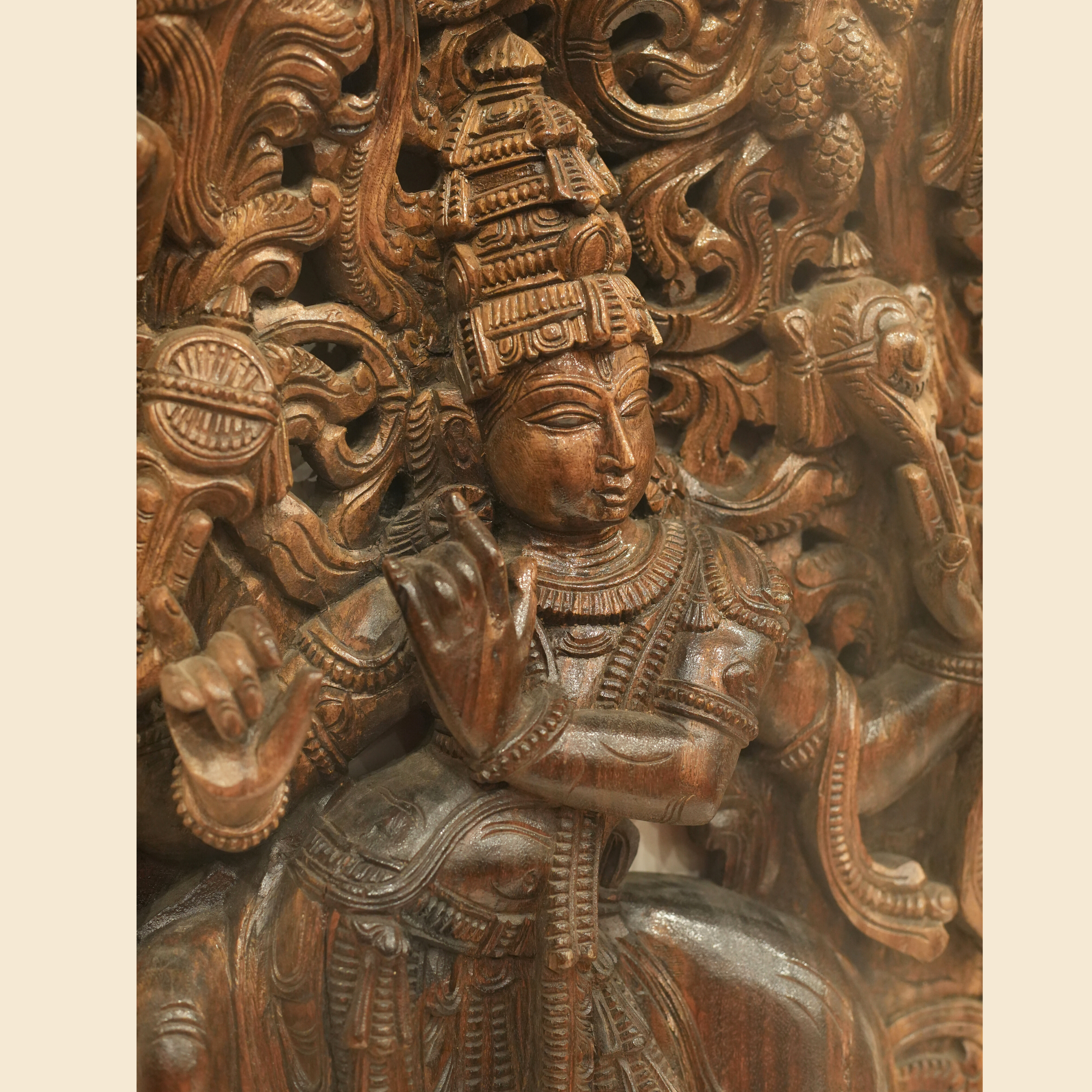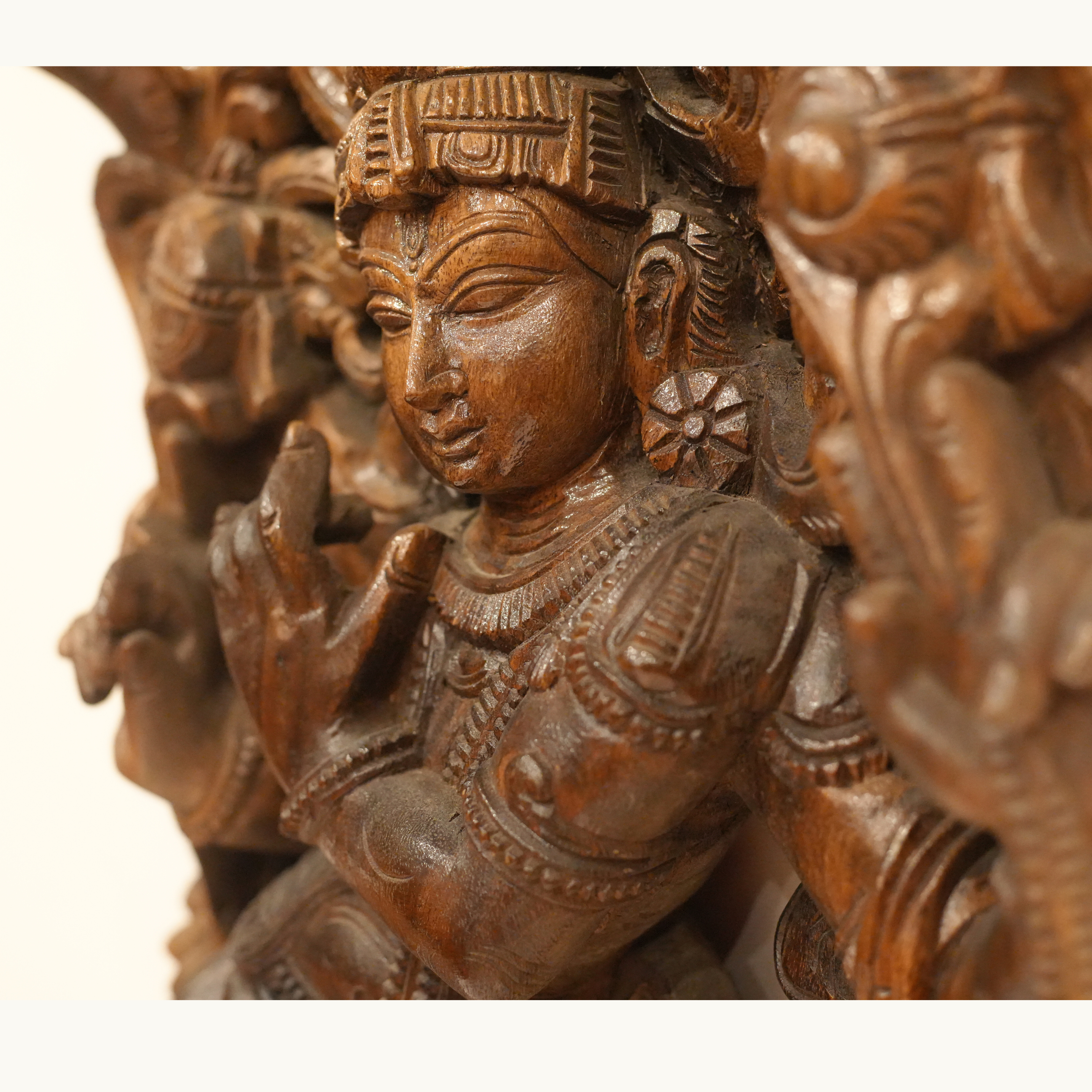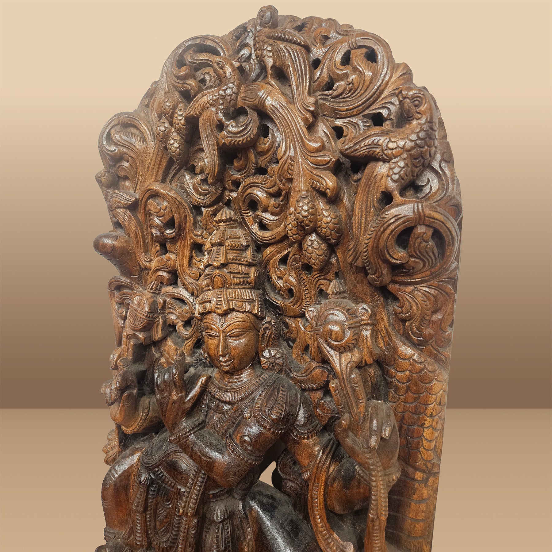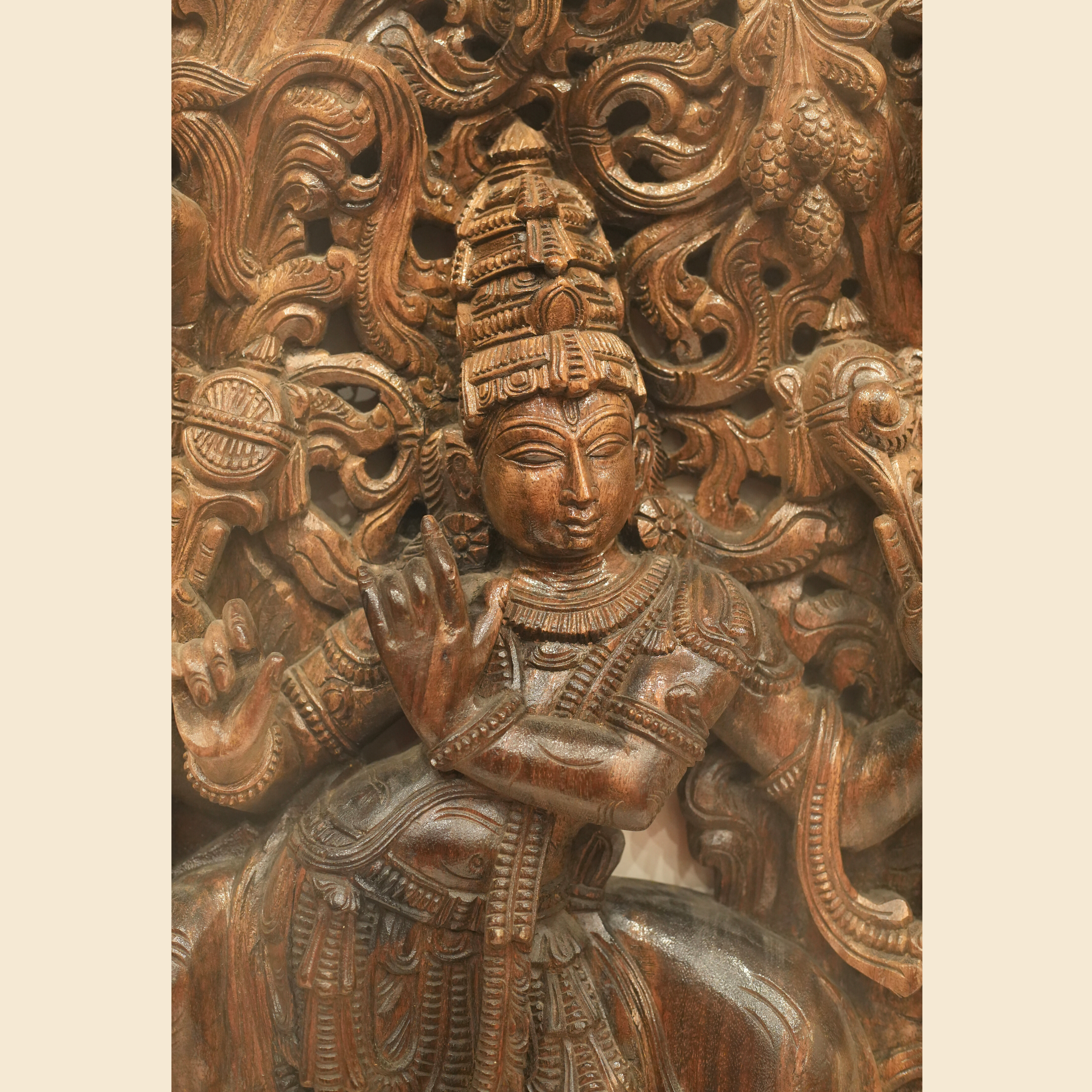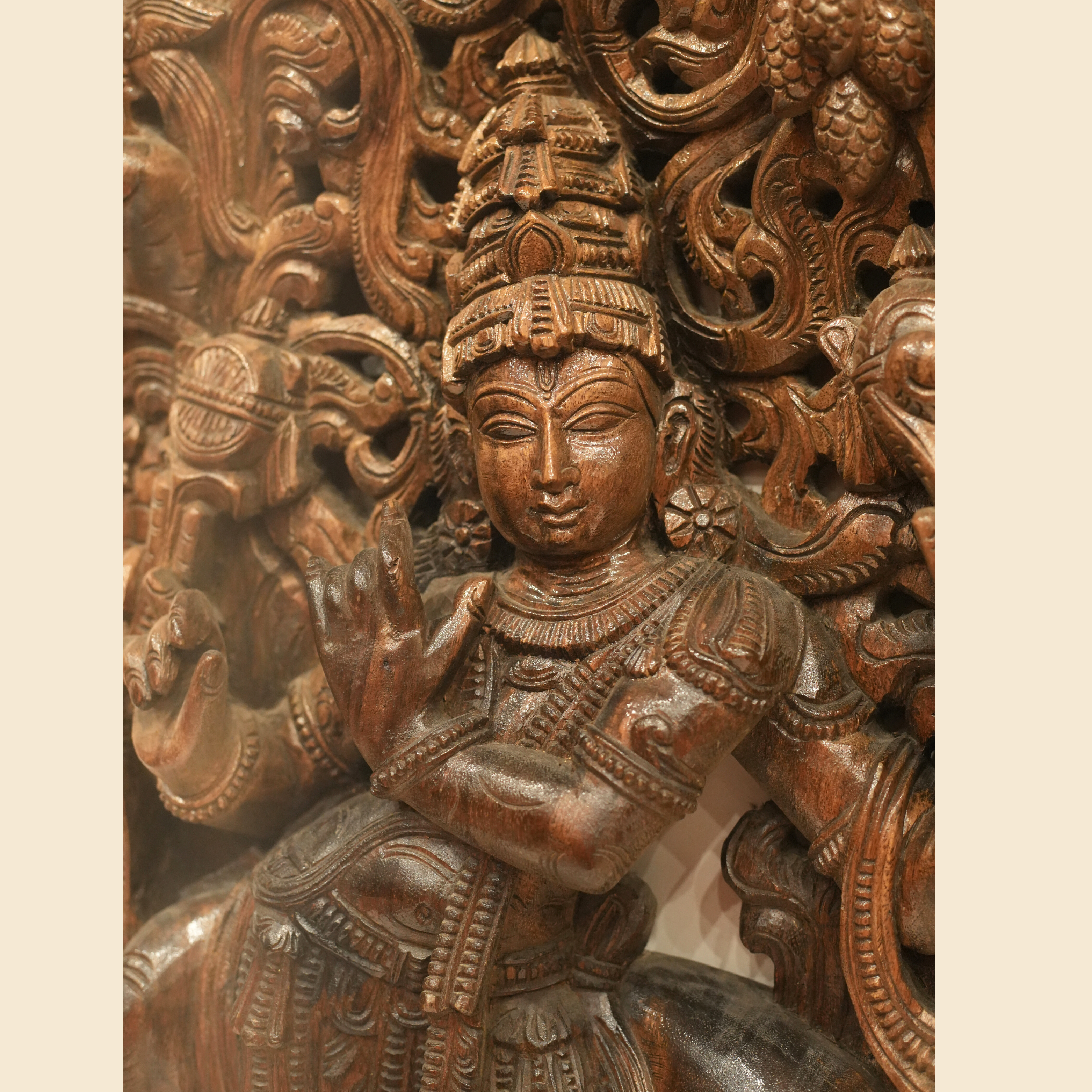 This exquisite wooden statue portrays Krishna gracefully playing his flute beneath a tree, accompanied by a serene cow. The sculpture is rich in intricate details, featuring birds . Inspired by Krishna’s childhood in Vrindavan, the scene captures his tranquil moments beneath the trees, where the melodies of his flute, Murali, resonated with purity and divine love. His enchanting music mesmerized the cows, Gopis, and all living beings, each note carrying a personal call to his beloved herd. This artistic representation embodies harmony, devotion, and the timeless essence of divine love.