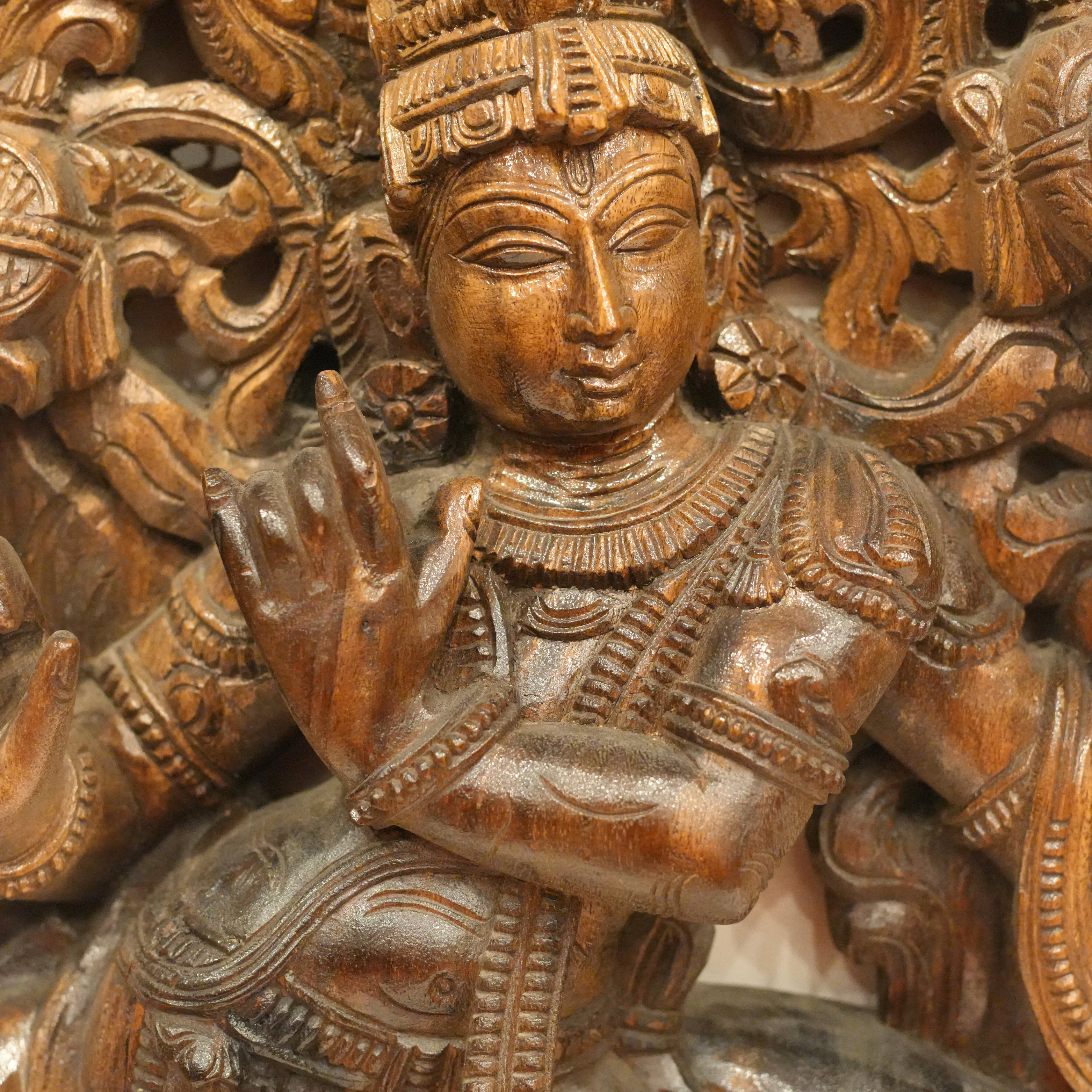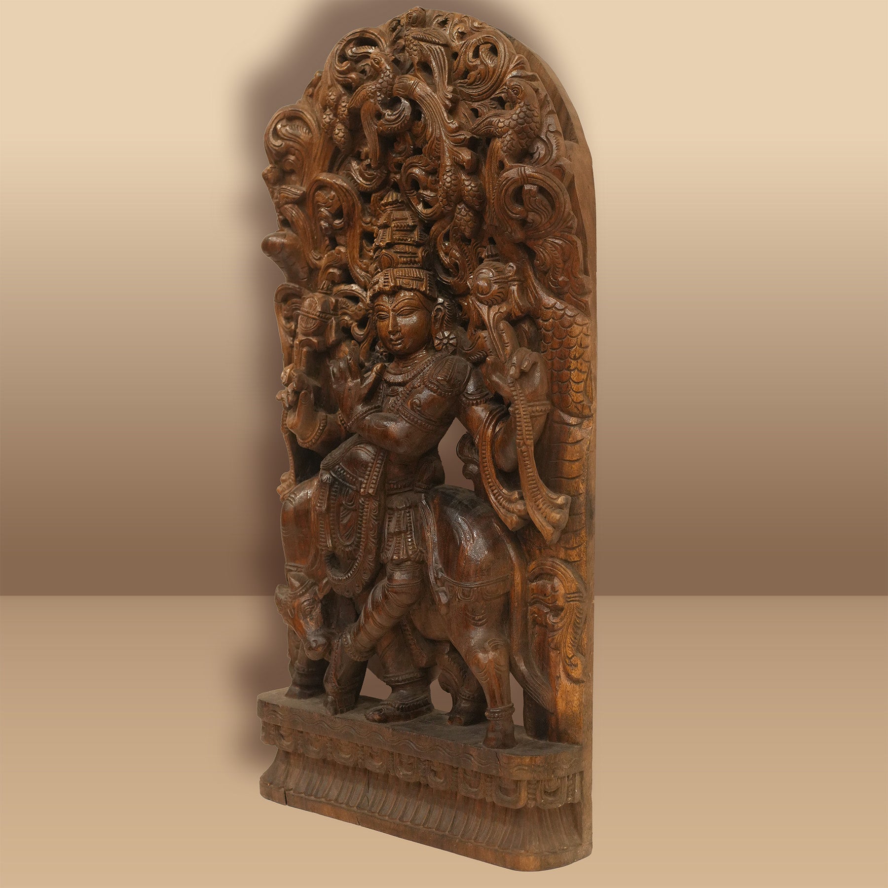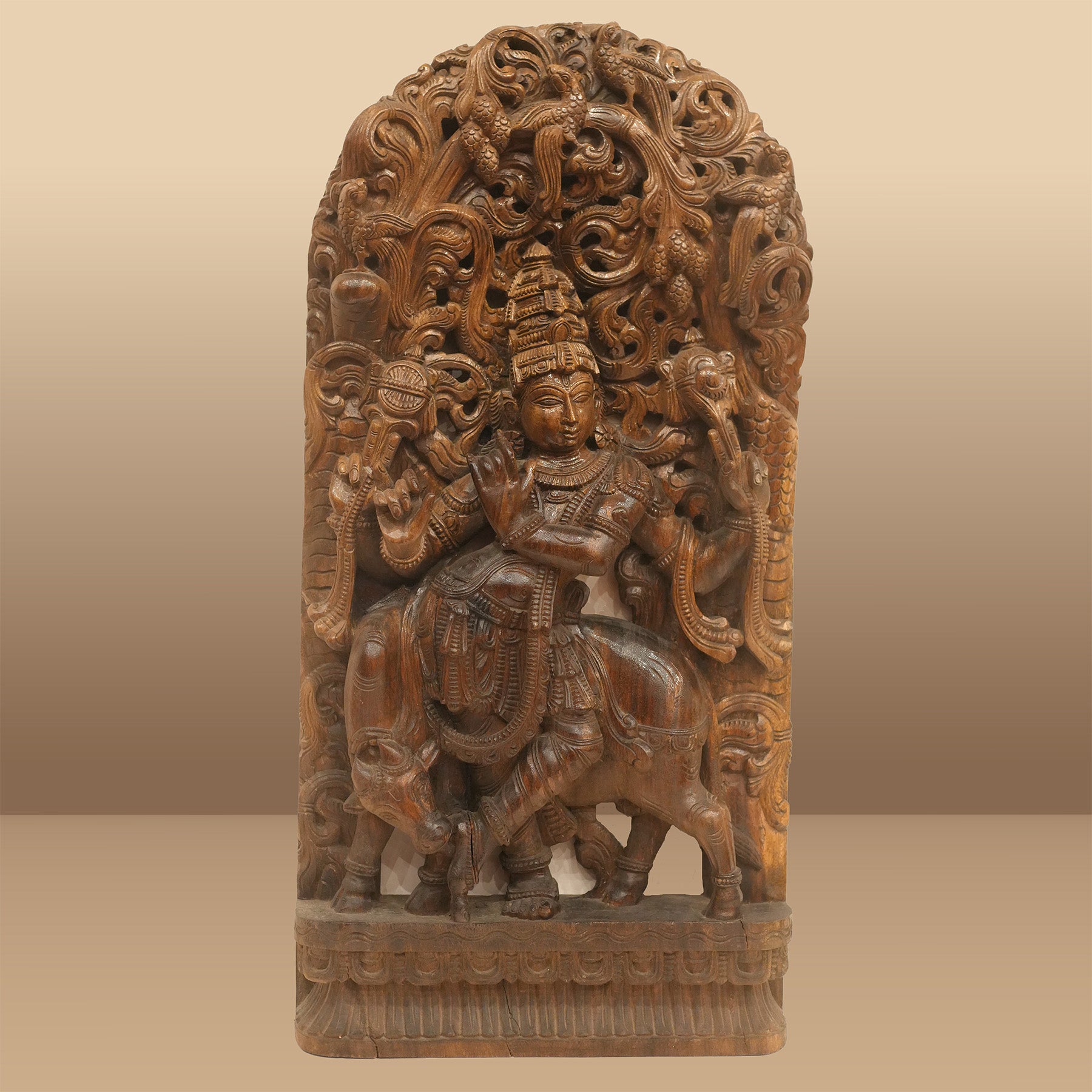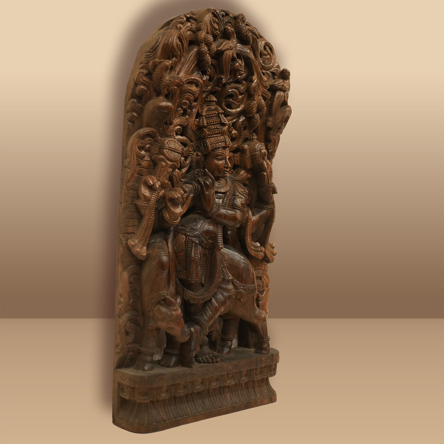 Rare One-of-a-Kind Hand Craved Wooden Lord Krishna Playing Flute with a Cow Wall Decor Browm Wood Carving Hindu God 35.5" Vintage Brown Rectangular Vertical Panel Hinduism