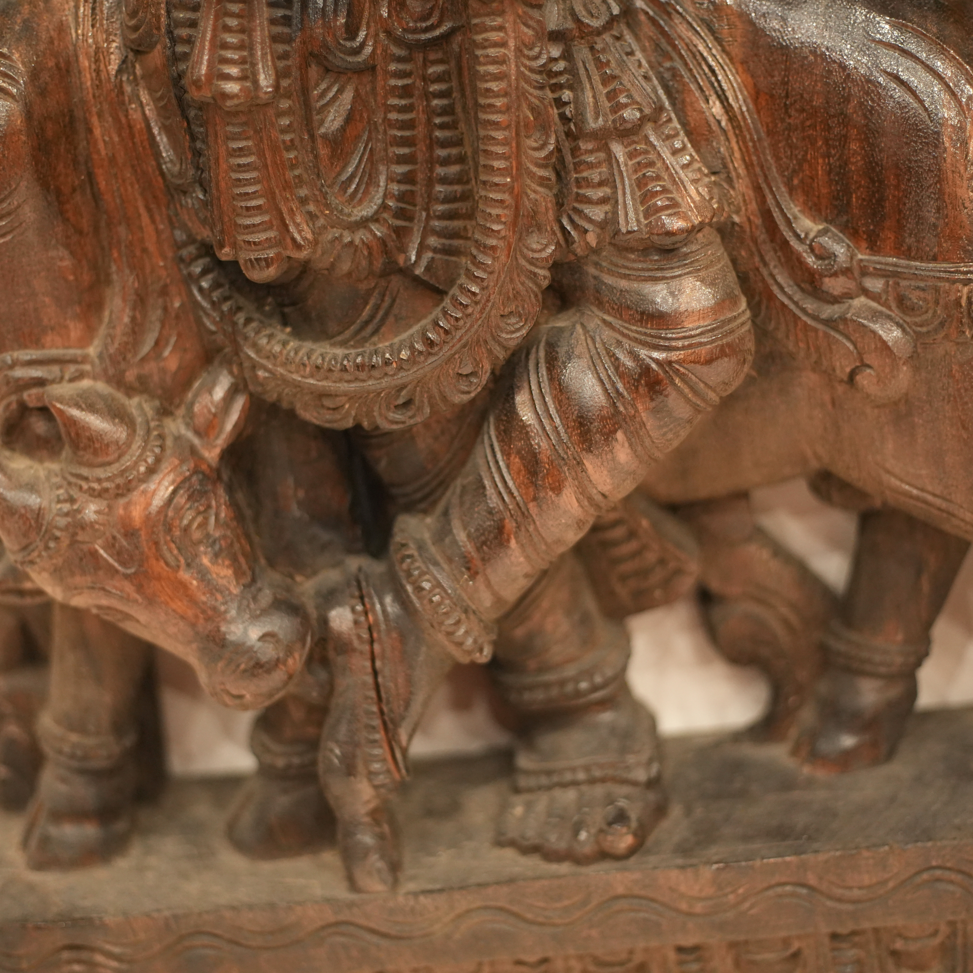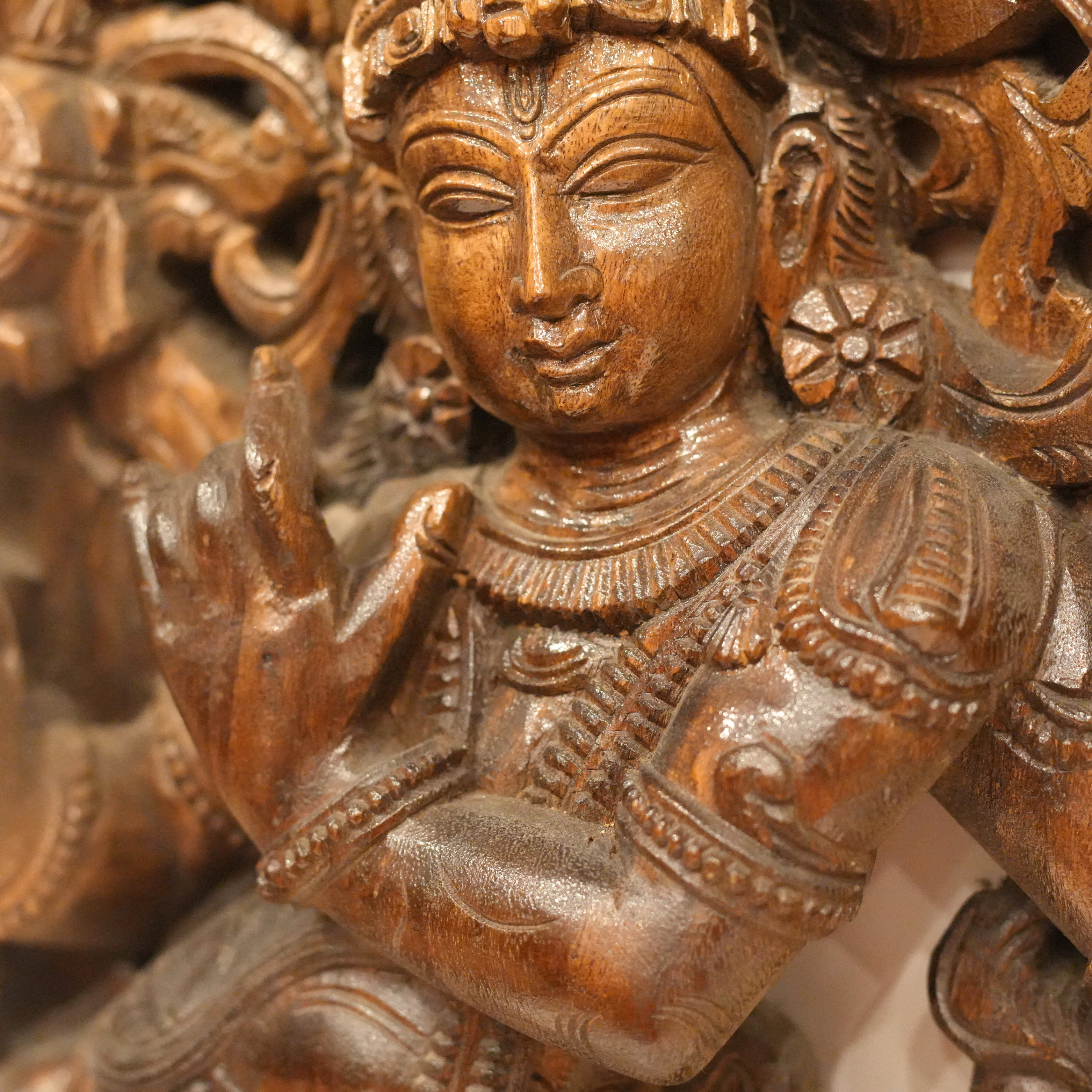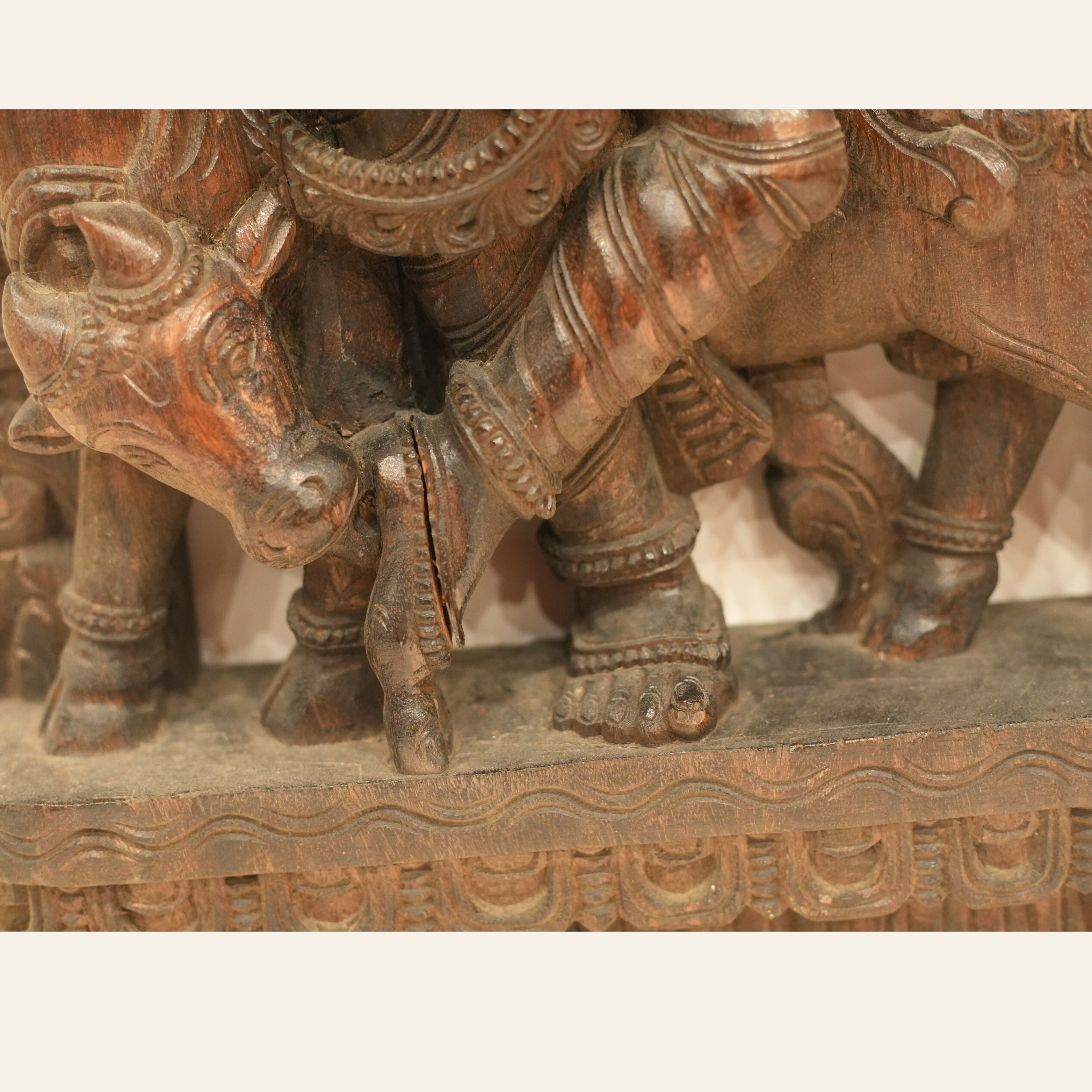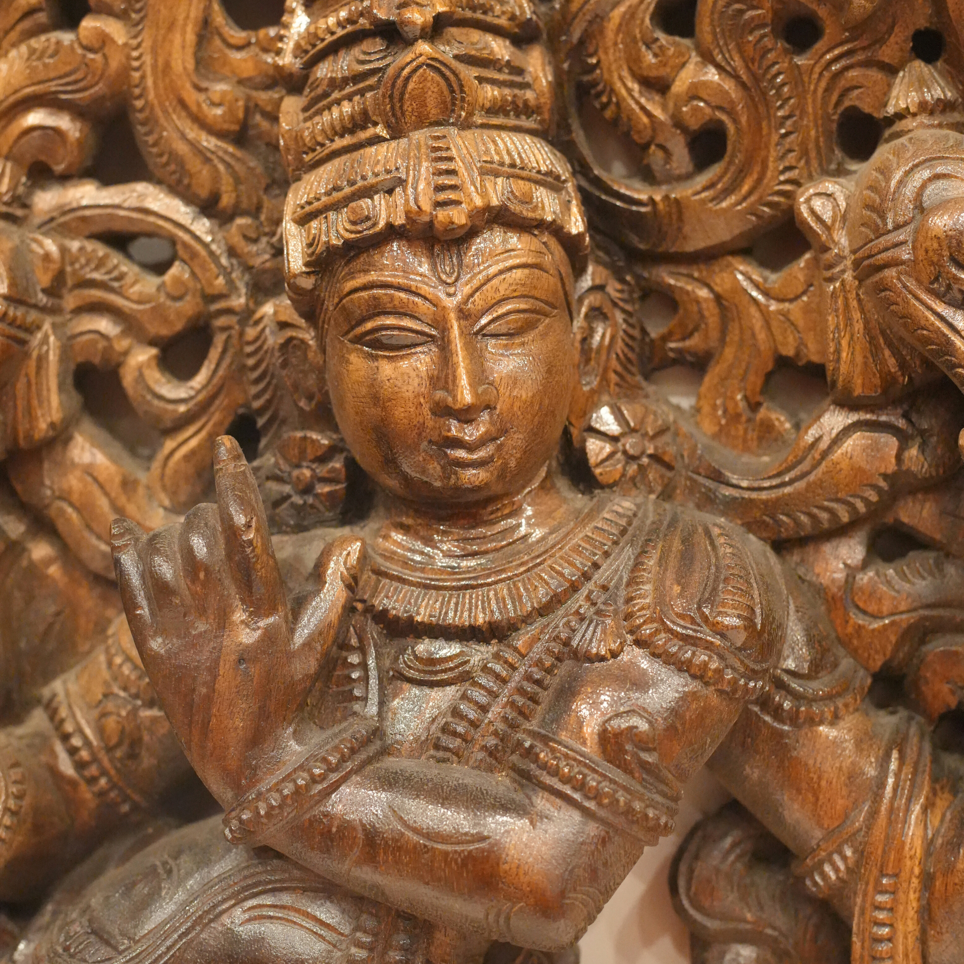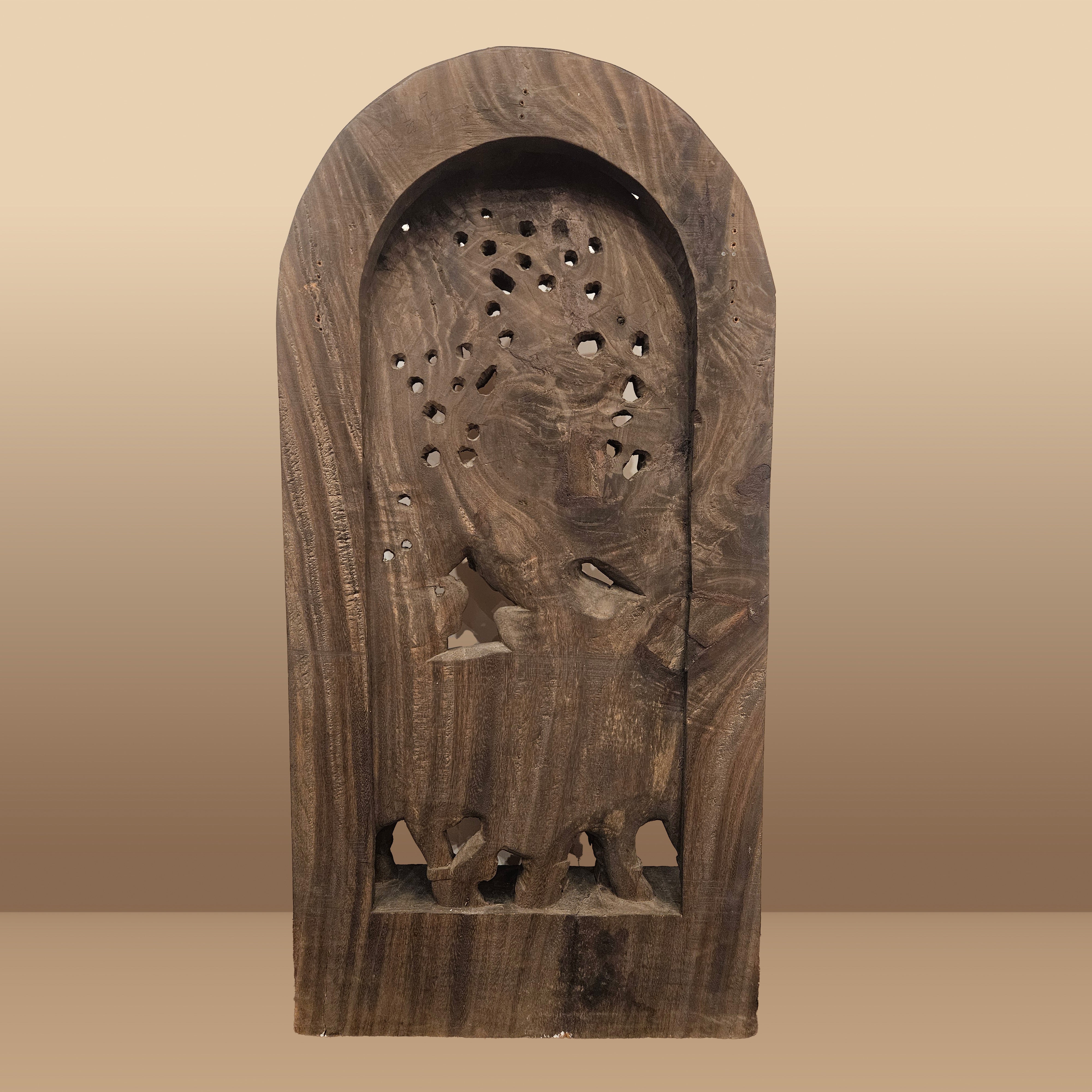 Rare One-of-a-Kind Hand Craved Wooden Lord Krishna Playing Flute with a Cow Wall Decor Browm Wood Carving Hindu God 35.5" Vintage Brown Rectangular Vertical Panel Hinduism